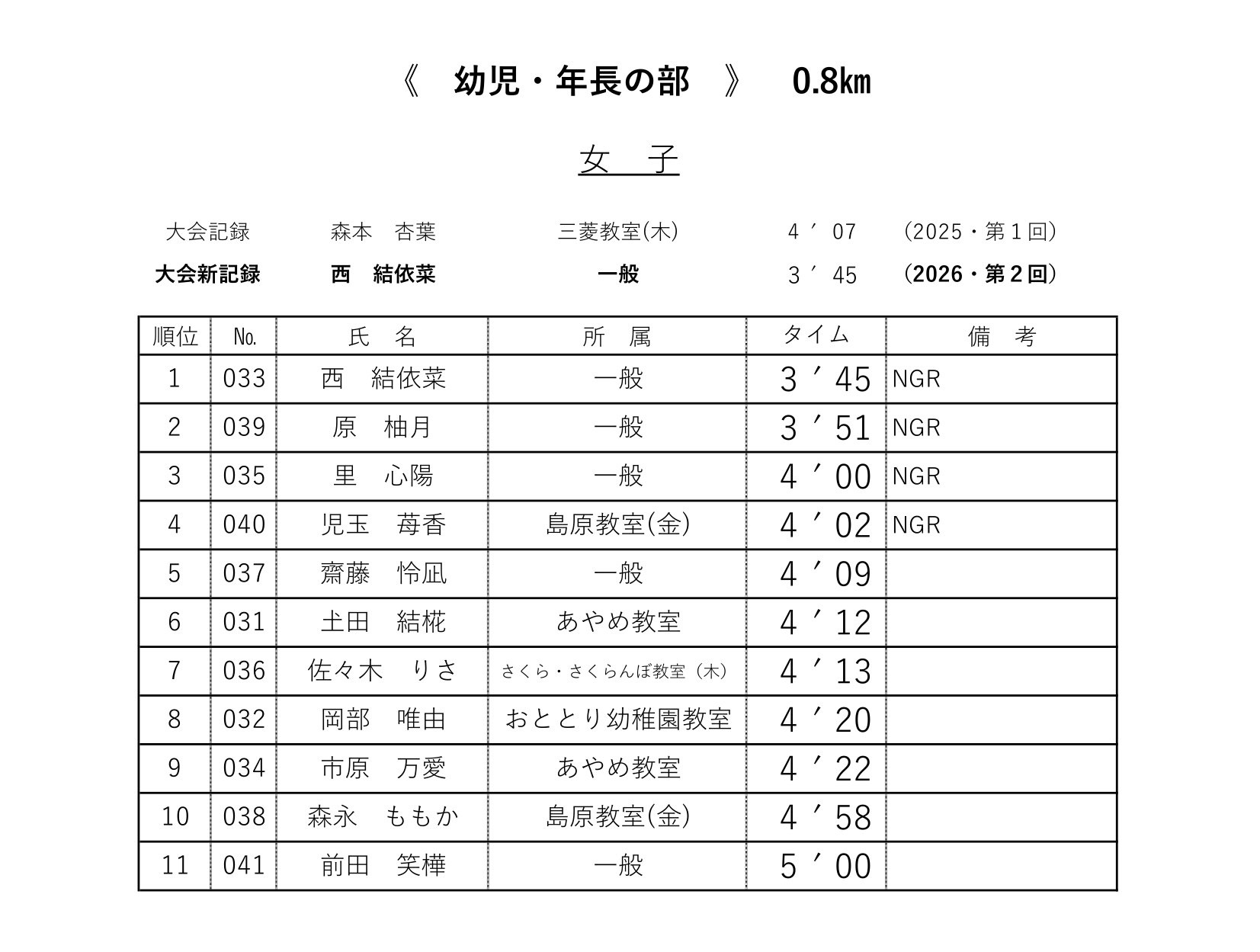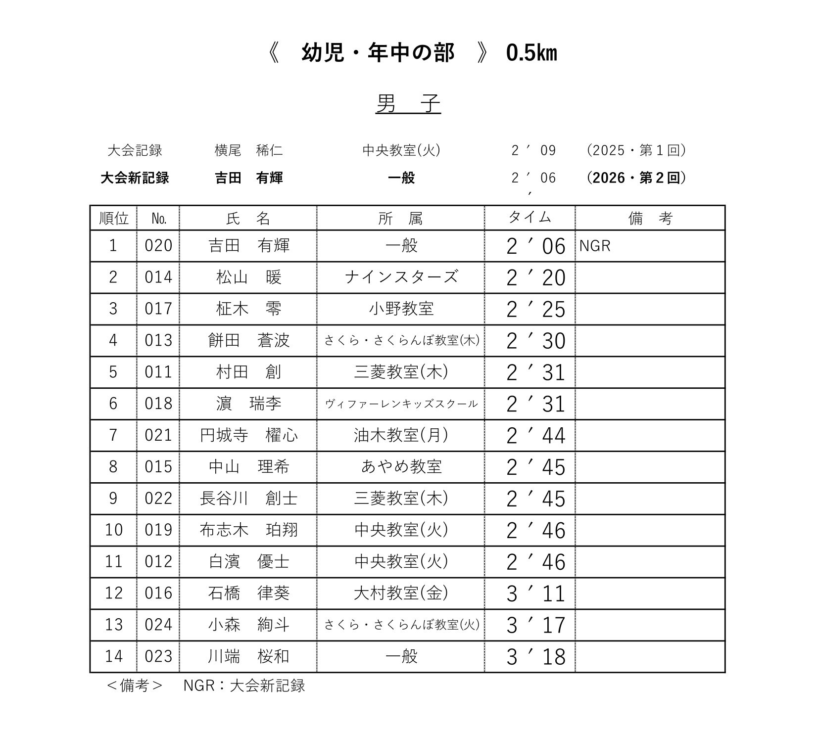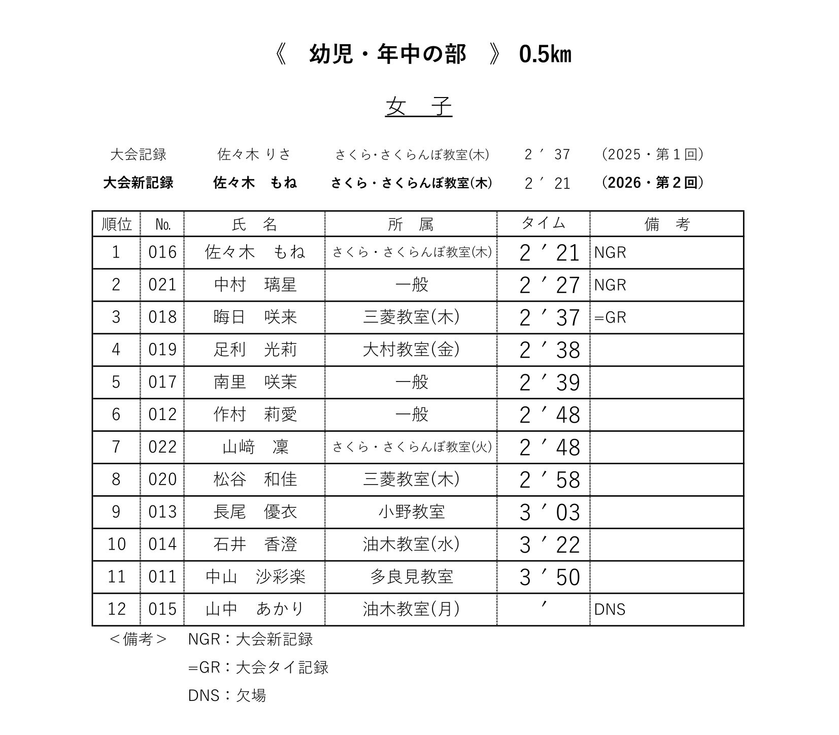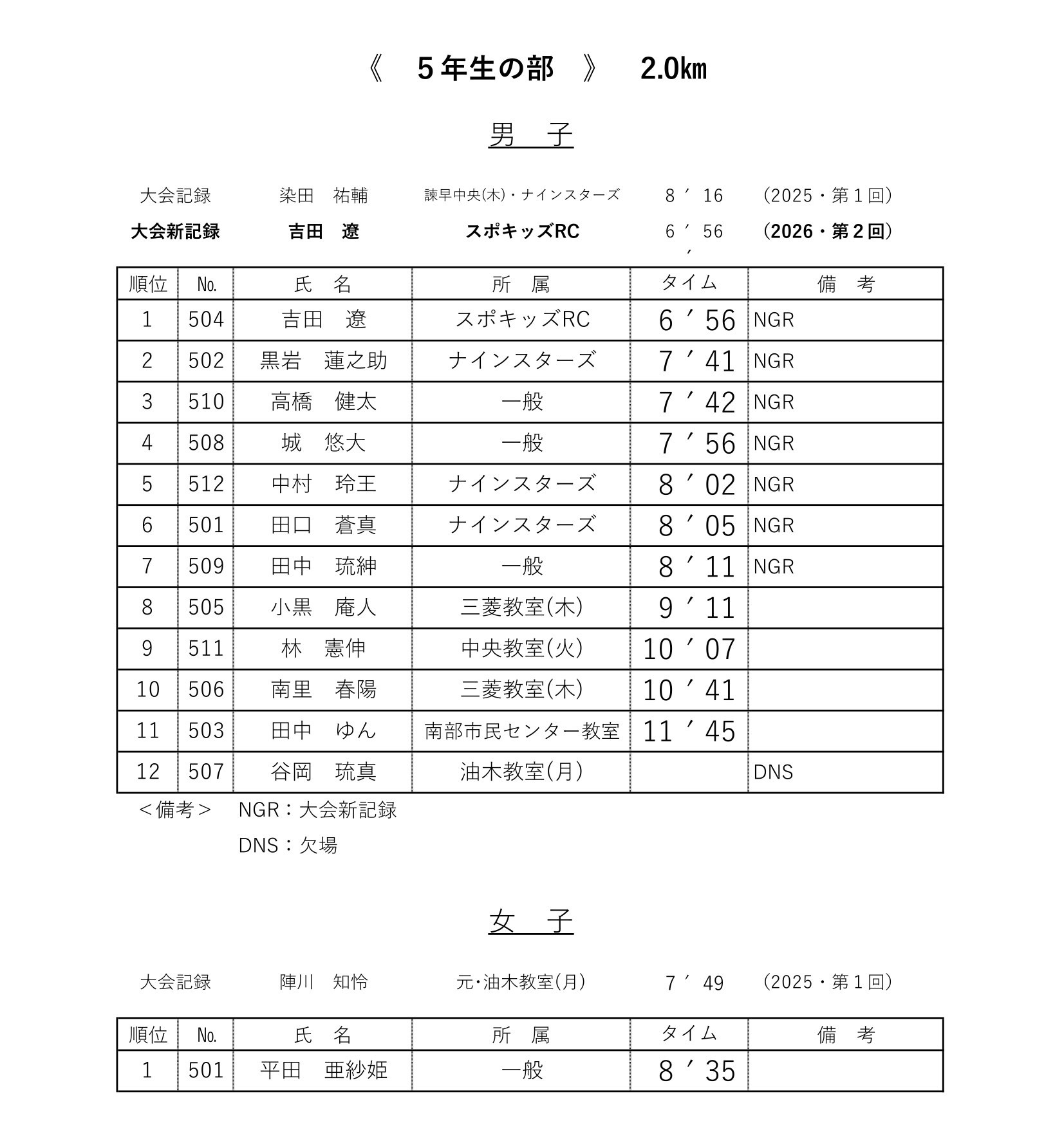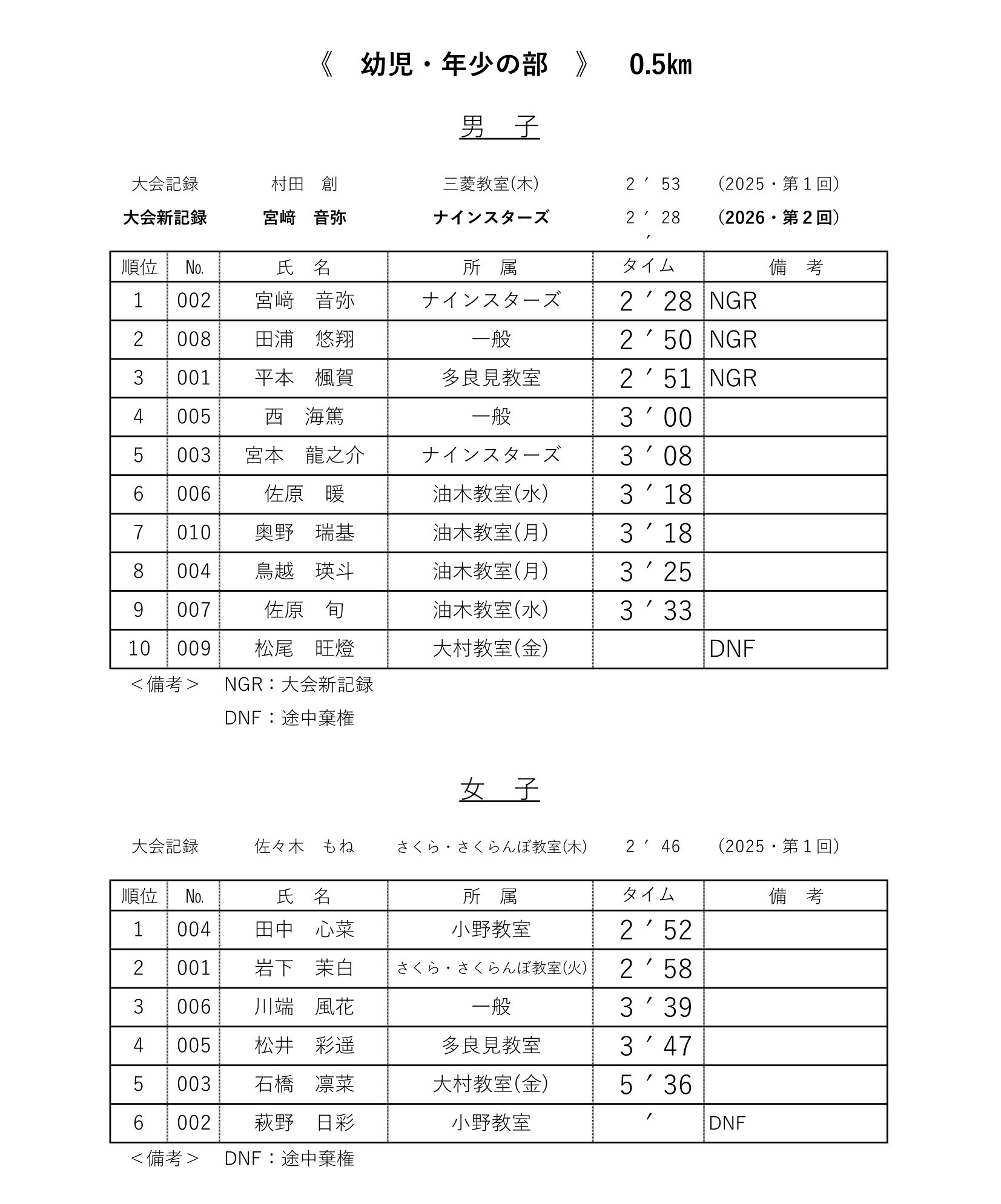 各レースの記録表を掲載いたします